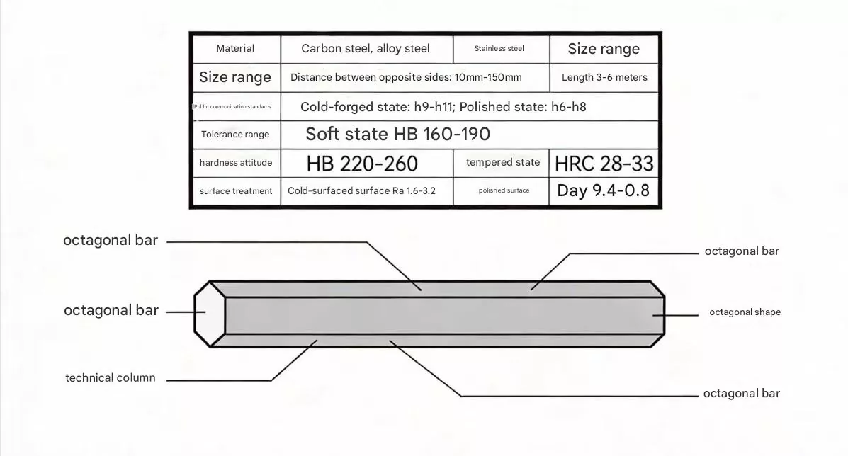Forma bereziko oktogono barra hau hotzeko doitasuneko prozesatzeko teknologiaren bidez moldatzen da, altzairu oktogonal erregular tradizionalaren mugak hautsiz tamainari eta formari dagokionez. Berariaz diseinatuta dago transmisio mekanikoa eta kokapen-gidaritza bezalako agertoki zehatzen koordinazio-beharrei erantzuteko, eta ondo molda daiteke lan-baldintza konplexuetan muntaketa eta erabilera-eskakizunetara, sistema mekanikoen funtzionamendu egonkorra izateko berme sendoak eskainiz.